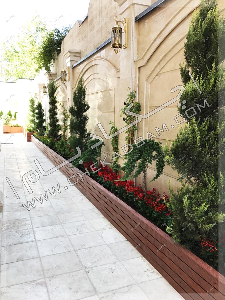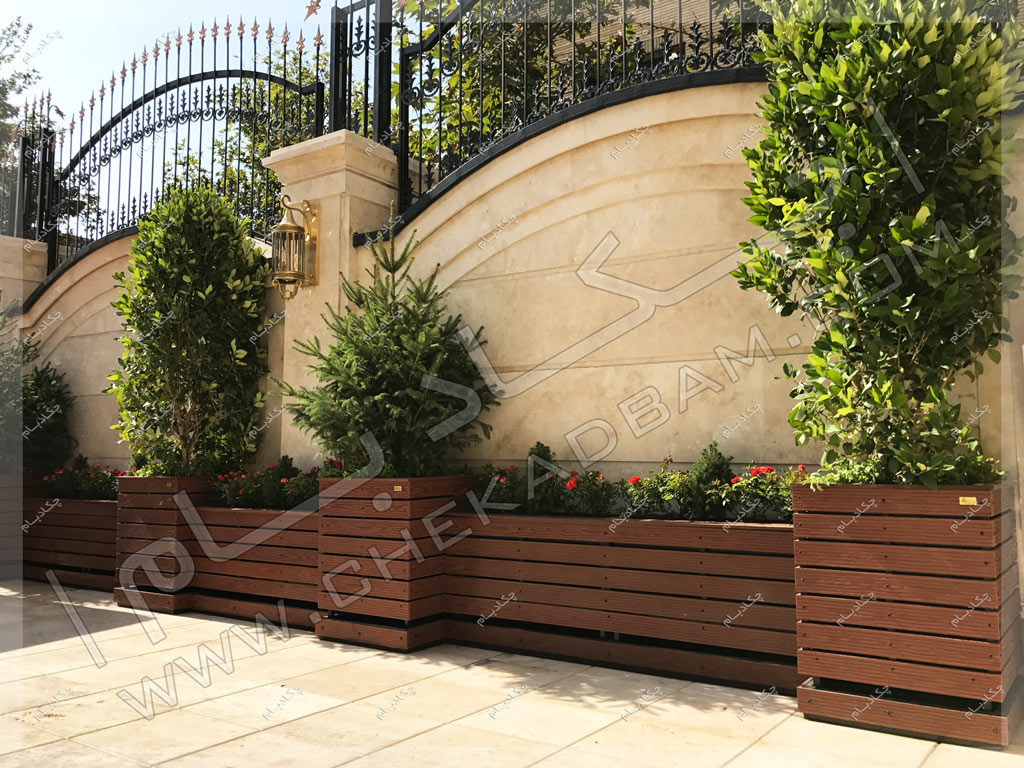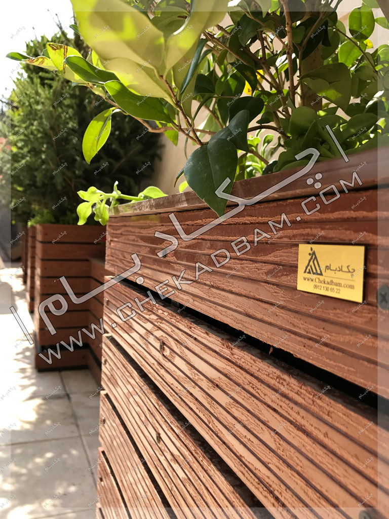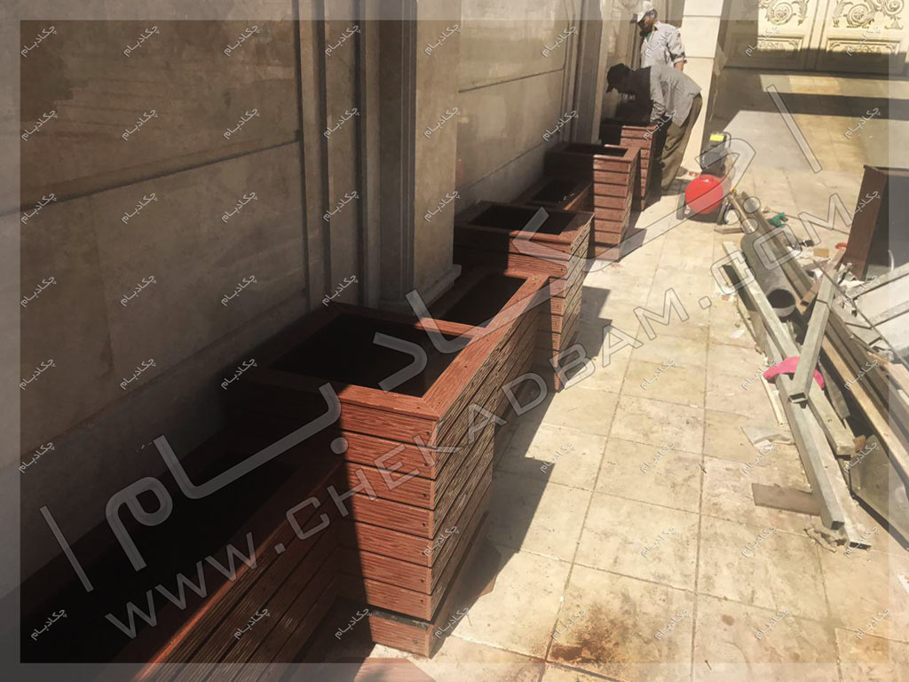در این پروژه فلاور باکس و تری باکس ها در کارگاه چکاد بام ساخته شده و در محل پروژه با متریال چوب پلاست کاور شدند . چرا که جهت شبیه سازی فلاور باکس ها به فرمت باغچه ،ضرورت داشت نمای آنها به صورت یکپارچه انجام شود.