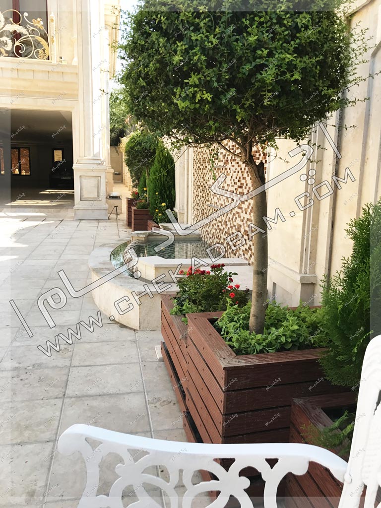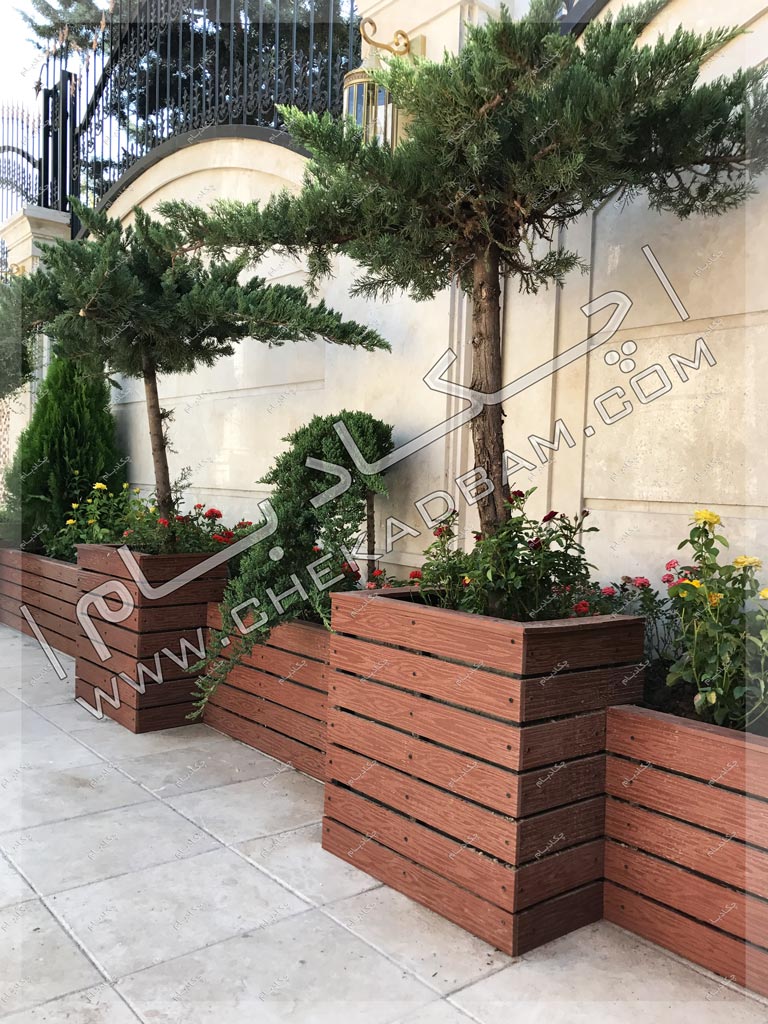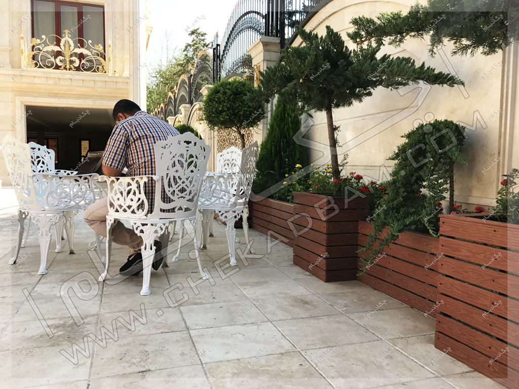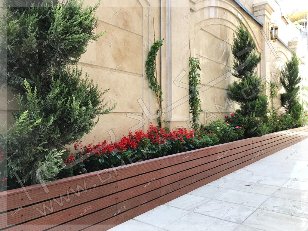 در این پروژه فلاور باکس و تری باکس ها در کارگاه چکاد بام ساخته شده و در محل پروژه با متریال چوب پلاست کاور شدند . چرا که جهت شبیه سازی فلاور باکس ها به فرمت باغچه ،ضرورت داشت نمای آنها به صورت یکپارچه انجام شود.